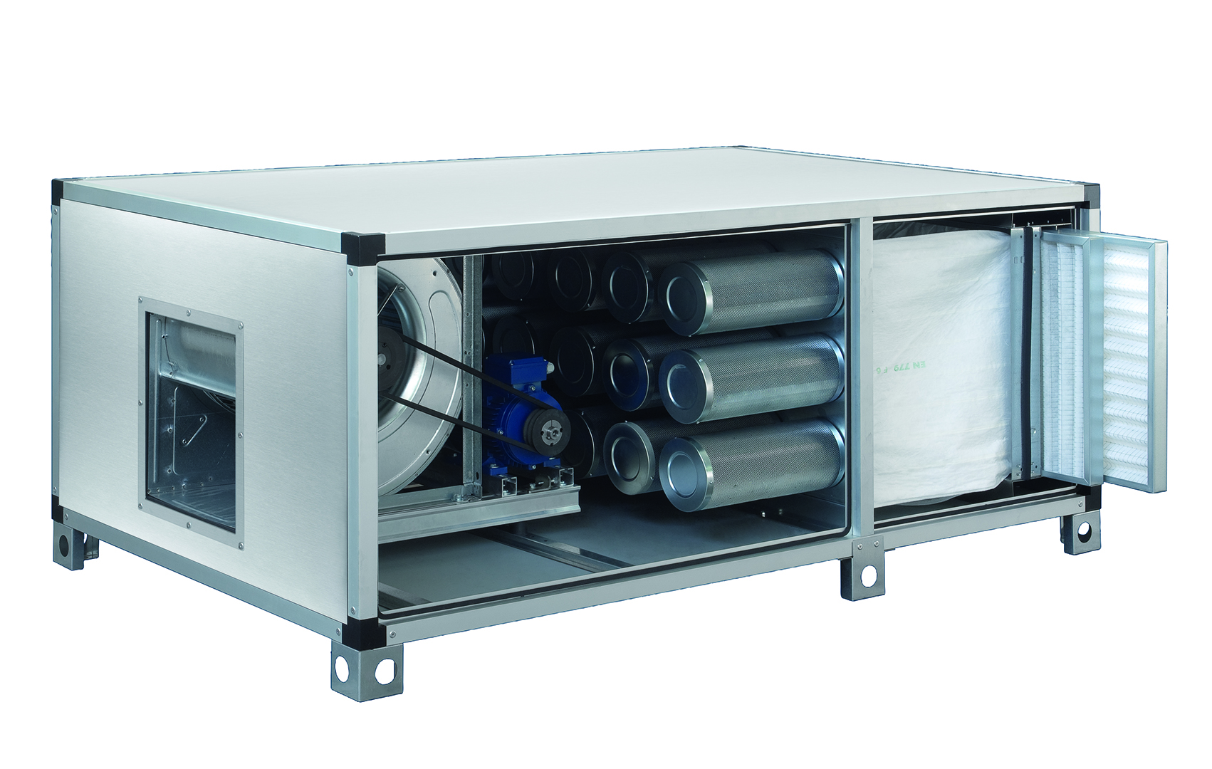 Si tratta di un gruppo di filtrazione e deodorizzazione dell'aria composto da ventilatore centrifugo a doppia aspirazione . È composto da prefiltro aria tipo EU3, 85% gravimetrico, cilindri con carbone vegetale attivo in cilindretti tipo 207/C e filtro a tasche tipo EU9 95%. Telaio in profilato d'alluminio e doppia pannellatura in lamiera all' interno e acciaio inossidabile all'esterno.