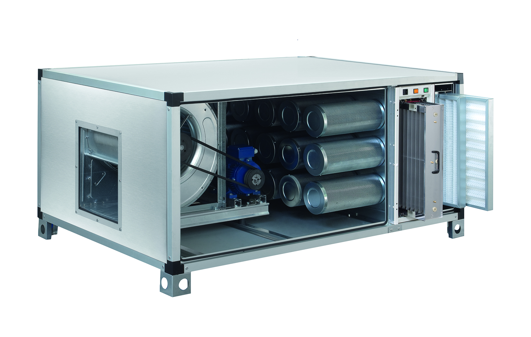 Si tratta di una centralina di deodorizzazione e filtrazione dell'aria completa di ventilatore a doppia aspirazione a rotore esterno. È composto da prefiltro aria tipo EU3, 85% gravimetrico con carbone vegetale attivo in cilindretti tipo 207/C e filtro elettrostatico ad alta intensità con termostato di protezione . Telaio in profilato d'alluminio, con coperture in acciaio inox.
