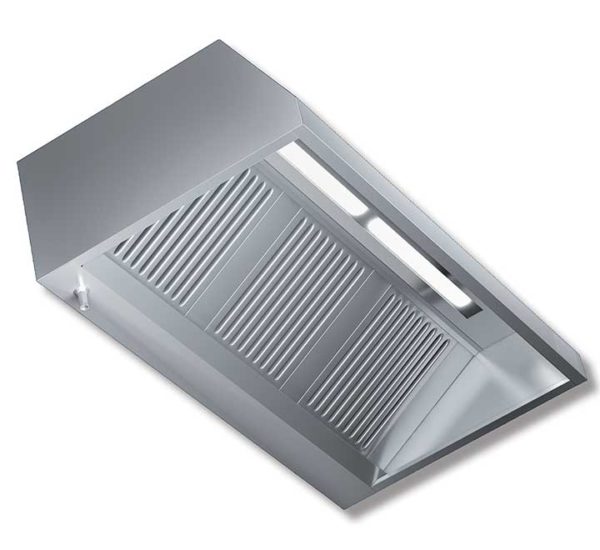 Cappa aspirante professionale progettata in acciaio Inox, realizzata con saldatura a punti e provvista di canalina anti sgocciolamento.