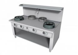 Cucina Wok modello con vano giorno realizzata in acciaio inox Aisi 340, dotata di piedini regolabili e piano liscio in acciaio spessore 2.5 mm rinforzati. dispone di: