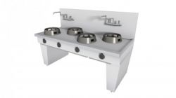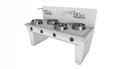 Cucina Wok modello su base ponte realizzata in acciaio inox Aisi 340, dotata di piedini regolabili e piano liscio in acciaio spessore 2.5 mm rinforzato. Dispone di: