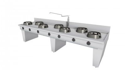 Cucina Wok modello su base ponte realizzata in acciaio inox Aisi 340, dotata di piedini regolabili e piano liscio in acciaio spessore 2.5 mm rinforzato. Dispone di: