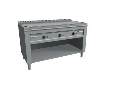 Teppanyaki a gas con zona cottura realizzata in acciaio inox AISI 304 e dotata di piastra di cottura liscia in acciaio (cromo duro lucido, spessore mm.15). Cetificazione di conformità CE/IMQ.