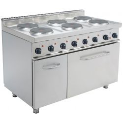 Piano Cottura Elettrico a 6 Piastre Tonde,Con Vano a Giorno Con Porta e Con Forno Elettrico Da 5,48 kW, Con Potenza 21,08 kW e Dimensioni: 1200x700x850h. Norma CE