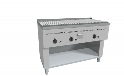 Bistecchiera a Pietra Lavica realizzata in acciaio inox AISI 304,puntata elettronicamente con satinatura Scotch-Brite e dotata di piedini regolabili. Fornita di griglia a "V" per la raccolta dei grassi di cottura, di canalina frontale con foro di scarico e cassettino raccolta olio e grassi estraibile. Bruciatori gas indipendenti a tre tubi con rubinetto valvolato, termocoppia e accensione piezo elettrica, con regolazione temperatura max-min. Padella raccolta residui estraibile sotto i bruciatori. Manopole in materiale atermico. Certificazione di conformità CE/IMQ.