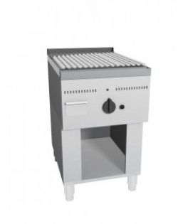Bistecchiera a Pietra Lavica realizzata in acciaio inox AISI 304,puntata elettronicamente con satinatura Scotch-Brite e dotata di piedini regolabili. Fornita di griglia a "V" per la raccolta dei grassi di cottura, di canalina frontale con foro di scarico e cassettino raccolta olio e grassi estraibile. Bruciatori gas indipendenti a tre tubi con rubinetto valvolato, termocoppia e accensione piezo elettrica, con regolazione temperatura max-min. Padella raccolta residui estraibile sotto i bruciatori. Manopole in materiale atermico. Certificazione di conformità CE/IMQ.