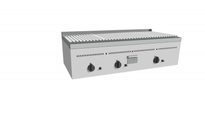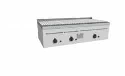 Bistecchiera a Pietra Lavica realizzata in acciaio inox AISI 304,puntata elettronicamente con satinatura Scotch-Brite e dotata di piedini regolabili. Fornita di griglia a "V" per la raccolta dei grassi di cottura, di canalina frontale con foro di scarico e cassettino raccolta olio e grassi estraibile. Bruciatori gas indipendenti a tre tubi con rubinetto valvolato, termocoppia e accensione piezo elettrica, con regolazione temperatura max-min. Padella raccolta residui estraibile sotto i bruciatori. Manopole in materiale atermico. Certificazione di conformità CE/IMQ.