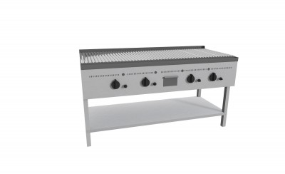 Bistecchiera a Pietra Lavica realizzata in acciaio inox AISI 304,puntata elettronicamente con satinatura Scotch-Brite e dotata di piedini regolabili. Fornita di griglia a "V" per la raccolta dei grassi di cottura, di canalina frontale con foro di scarico e cassettino raccolta olio e grassi estraibile. Bruciatori gas indipendenti a tre tubi con rubinetto valvolato, termocoppia e accensione piezo elettrica, con regolazione temperatura max-min. Padella raccolta residui estraibile sotto i bruciatori. Manopole in materiale atermico. Certificazione di conformità CE/IMQ.
