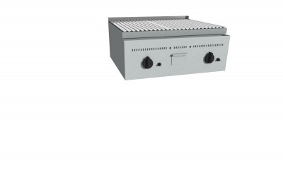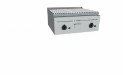 Bistecchiera a Pietra Lavica realizzata in acciaio inox AISI 304,puntata elettronicamente con satinatura Scotch-Brite e dotata di piedini regolabili. Fornita di griglia a "V" per la raccolta dei grassi di cottura, di canalina frontale con foro di scarico e cassettino raccolta olio e grassi estraibile. Bruciatori gas indipendenti a tre tubi con rubinetto valvolato, termocoppia e accensione piezo elettrica, con regolazione temperatura max-min. Padella raccolta residui estraibile sotto i bruciatori. Manopole in materiale atermico. Certificazione di conformità CE/IMQ.