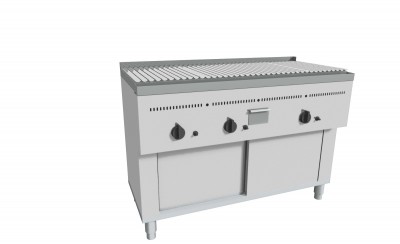 Bistecchiera a Pietra Lavica realizzata in acciaio inox AISI 304,puntata elettronicamente con satinatura Scotch-Brite e dotata di piedini regolabili. Fornita di griglia a "V" per la raccolta dei grassi di cottura, di canalina frontale con foro di scarico e cassettino raccolta olio e grassi estraibile. Bruciatori gas indipendenti a tre tubi con rubinetto valvolato, termocoppia e accensione piezo elettrica, con regolazione temperatura max-min. Padella raccolta residui estraibile sotto i bruciatori. Manopole in materiale atermico. Certificazione di conformità CE/IMQ.
