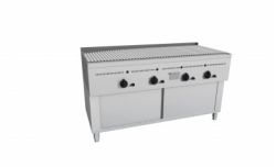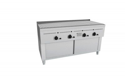 Bistecchiera a Pietra Lavica realizzata in acciaio inox AISI 304,puntata elettronicamente con satinatura Scotch-Brite e dotata di piedini regolabili. Fornita di griglia a "V" per la raccolta dei grassi di cottura, di canalina frontale con foro di scarico e cassettino raccolta olio e grassi estraibile. Bruciatori gas indipendenti a tre tubi con rubinetto valvolato, termocoppia e accensione piezo elettrica, con regolazione temperatura max-min. Padella raccolta residui estraibile sotto i bruciatori. Manopole in materiale atermico. Certificazione di conformità CE/IMQ.
