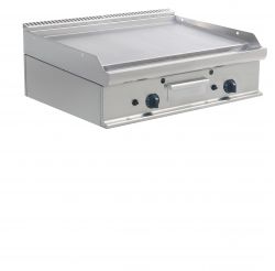 Piastra Cuoci Piadina a gas realizzata in acciaio inox AISI 304 dotata di piano di cottura liscio e di piedini regolabili. Dispone di camino di scarico fumi posteriore. Bruciatori gas indipendenti a tre tubi fiamma gas ad alto rendimento con rubinetto valvolato, termocoppia e accensione piezo elettrica. Rregolazione temperatura max-min. Manopole in materiale atermico. Certificazione di conformità CE/IMQ.