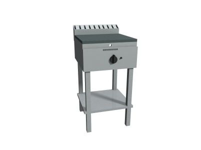 Piastra Cuoci Piadina a gas realizzata in acciaio inox AISI 304 dotata di piano di cottura liscio e di piedini regolabili. Dispone di camino di scarico fumi posteriore. Bruciatori gas indipendenti a tre tubi fiamma gas ad alto rendimento con rubinetto valvolato, termocoppia e accensione piezo elettrica. Rregolazione temperatura max-min. Manopole in materiale atermico. Certificazione di conformità CE/IMQ.