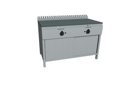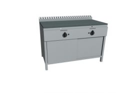 Piastra Cuoci Piadina a gas realizzata in acciaio inox AISI 304 dotata di piano di cottura liscio e di piedini regolabili. Dispone di camino di scarico fumi posteriore. Bruciatori gas indipendenti a tre tubi fiamma gas ad alto rendimento con rubinetto valvolato, termocoppia e accensione piezo elettrica. Rregolazione temperatura max-min. Manopole in materiale atermico. Certificazione di conformità CE/IMQ.