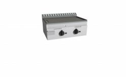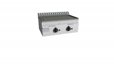 Piastra Cuoci Piadina a gas realizzata in acciaio inox AISI 304 dotata di piano di cottura liscio e di piedini regolabili. Dispone di camino di scarico fumi posteriore. Bruciatori gas indipendenti a tre tubi fiamma gas ad alto rendimento con rubinetto valvolato, termocoppia e accensione piezo elettrica. Rregolazione temperatura max-min. Manopole in materiale atermico. Certificazione di conformità CE/IMQ.