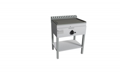 Piastra Cuoci Piadina a gas realizzata in acciaio inox AISI 304 dotata di piano di cottura liscio e di piedini regolabili. Dispone di camino di scarico fumi posteriore. Bruciatori gas indipendenti a tre tubi fiamma gas ad alto rendimento con rubinetto valvolato, termocoppia e accensione piezo elettrica. Rregolazione temperatura max-min. Manopole in materiale atermico. Certificazione di conformità CE/IMQ.