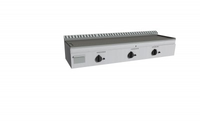 Piastra Cuoci Piadina a gas realizzata in acciaio inox AISI 304 dotata di piano di cottura liscio e di piedini regolabili. Dispone di camino di scarico fumi posteriore. Bruciatori gas indipendenti a tre tubi fiamma gas ad alto rendimento con rubinetto valvolato, termocoppia e accensione piezo elettrica. Rregolazione temperatura max-min. Manopole in materiale atermico. Certificazione di conformità CE/IMQ.