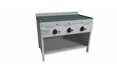 Piastra Cuoci Piadina a gas realizzata in acciaio inox AISI 304 dotata di piano di cottura liscio e di piedini regolabili. Dispone di camino di scarico fumi posteriore. Bruciatori gas indipendenti a tre tubi fiamma gas ad alto rendimento con rubinetto valvolato, termocoppia e accensione piezo elettrica. Rregolazione temperatura max-min. Manopole in materiale atermico. Certificazione di conformità CE/IMQ.