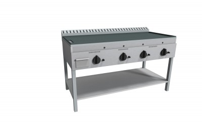 Piastra Cuoci Piadina a gas realizzata in acciaio inox AISI 304 dotata di piano di cottura liscio e di piedini regolabili. Dispone di camino di scarico fumi posteriore. Bruciatori gas indipendenti a tre tubi fiamma gas ad alto rendimento con rubinetto valvolato, termocoppia e accensione piezo elettrica. Rregolazione temperatura max-min. Manopole in materiale atermico. Certificazione di conformità CE/IMQ.