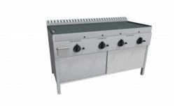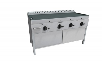 Piastra Cuoci Piadina a gas realizzata in acciaio inox AISI 304 dotata di piano di cottura liscio e di piedini regolabili. Dispone di camino di scarico fumi posteriore. Bruciatori gas indipendenti a tre tubi fiamma gas ad alto rendimento con rubinetto valvolato, termocoppia e accensione piezo elettrica. Rregolazione temperatura max-min. Manopole in materiale atermico. Certificazione di conformità CE/IMQ.