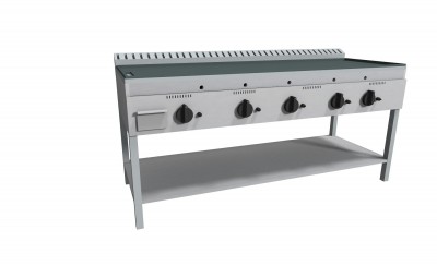 Piastra Cuoci Piadina a gas realizzata in acciaio inox AISI 304 dotata di piano di cottura liscio e di piedini regolabili. Dispone di camino di scarico fumi posteriore. Bruciatori gas indipendenti a tre tubi fiamma gas ad alto rendimento con rubinetto valvolato, termocoppia e accensione piezo elettrica. Rregolazione temperatura max-min. Manopole in materiale atermico. Certificazione di conformità CE/IMQ.