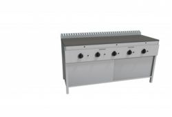 Piastra Cuoci Piadina a gas realizzata in acciaio inox AISI 304 dotata di piano di cottura liscio e di piedini regolabili. Dispone di camino di scarico fumi posteriore. Bruciatori gas indipendenti a tre tubi fiamma gas ad alto rendimento con rubinetto valvolato, termocoppia e accensione piezo elettrica. Rregolazione temperatura max-min. Manopole in materiale atermico. Certificazione di conformità CE/IMQ.