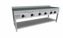 Piastra Cuoci Piadina a gas realizzata in acciaio inox AISI 304 dotata di piano di cottura liscio e di piedini regolabili. Dispone di camino di scarico fumi posteriore. Bruciatori gas indipendenti a tre tubi fiamma gas ad alto rendimento con rubinetto valvolato, termocoppia e accensione piezo elettrica. Rregolazione temperatura max-min. Manopole in materiale atermico. Certificazione di conformità CE/IMQ.