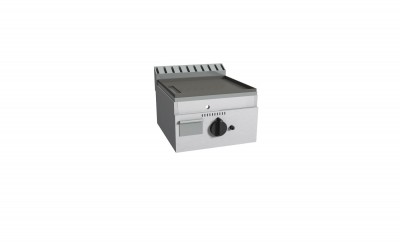 Piastra Cuoci Piadina a gas realizzata in acciaio inox AISI 304 dotata di piano di cottura liscio e di piedini regolabili. Dispone di camino di scarico fumi posteriore. Bruciatori gas indipendenti a tre tubi fiamma gas ad alto rendimento con rubinetto valvolato, termocoppia e accensione piezo elettrica. Rregolazione temperatura max-min. Manopole in materiale atermico. Certificazione di conformità CE/IMQ.