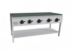 Piastra Cuoci Piadina e Salsiccia elettrica realizzata in acciaio inox AISI 304 dotata di piano di cottura liscio, (bordato su quattro lati, con foro di scarico e cassettino raccolta residui) e di piedini regolabili. Grazie al fissaggio dei blocchi resistenze in acciaio nella parte inferiore vi è uniformità di distribuzione della temperatura. Potenza kW 2,2 cadauno 230V~50Hz, dispone di interruttore e termostato di lavoro per regolazione temperatura 66 – 324°, con lampada spia generale e spia di funzionamento elementi riscaldanti. Manopole in materiale atermico. Certificazione di conformità CE/IMQ.