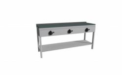 Piastra Cuoci Piadina elettrica realizzata in acciaio inox AISI 304 dotata di piano di cottura liscio e di piedini regolabili. Grazie al fissaggio dei blocchi resistenze in acciaio nella parte inferiore vi è uniformità di distribuzione della temperatura. Potenza kW 2,2 cadauno 230V~50Hz, idispone di nterruttore e termostato di lavoro per regolazione temperatura 66 – 324°, con lampada spia generale e spia di funzionamento elementi riscaldanti. Manopole in materiale atermico. Certificazione di conformità CE/IMQ.