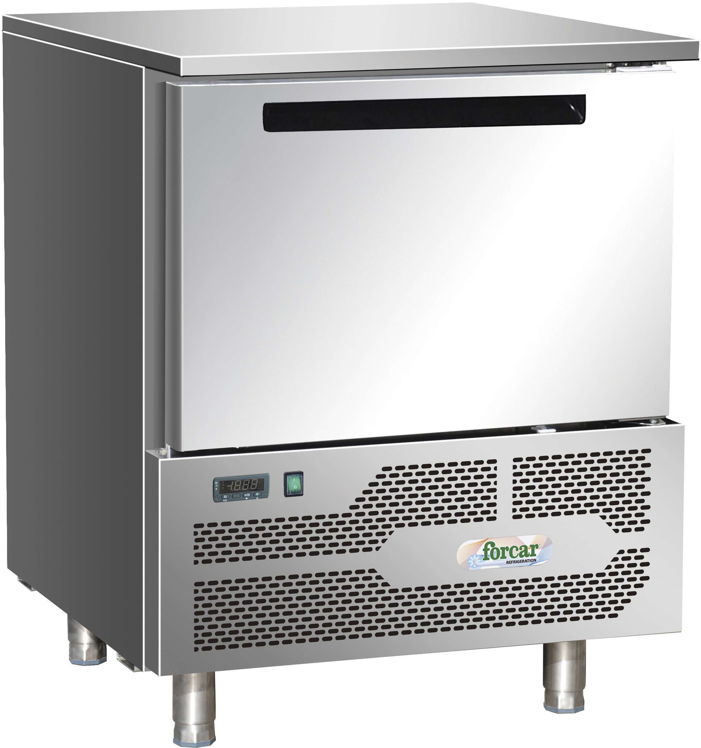 Abbattitore realizzato in acciaio inox AISI 304, con finitura esterna satinata Scotch Brite e dotato di piedini regolabili, spessore isolamento 60mm con schiuma alta densità 42kg/m3, cella interna con angoli arrotondati e guide adatte per contenere bacinelle GN1/1 o 600X400. Dispone di porta reversibile con guarnizione magnetica asportabile esonda per misurazione temperatura al cuore del prodotto. Infine micro porta magnetico per blocco ventilatore evaporatore, controllo elettronico, svuotamento manuale dell'acqua di sbrinamento, sbrinamento a ventilazione e 4 cicli di funzionamento.