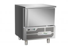 Abbattitore realizzato in acciaio inox AISI 304, con finitura esterna satinata Scotch Brite e dotato di piedini regolabili, spessore isolamento 60mm con schiuma alta densità 42kg/m3, cella interna con angoli arrotondati e guide adatte per contenere bacinelle GN1/1 o 600X400. Dispone di porta reversibile con guarnizione magnetica asportabile esonda per misurazione temperatura al cuore del prodotto. Infine micro porta magnetico per blocco ventilatore evaporatore, controllo elettronico, svuotamento manuale dell'acqua di sbrinamento, sbrinamento a ventilazione e 4 cicli di funzionamento.