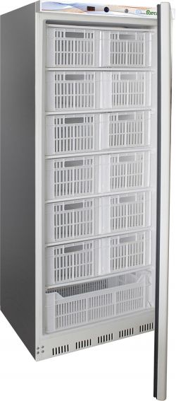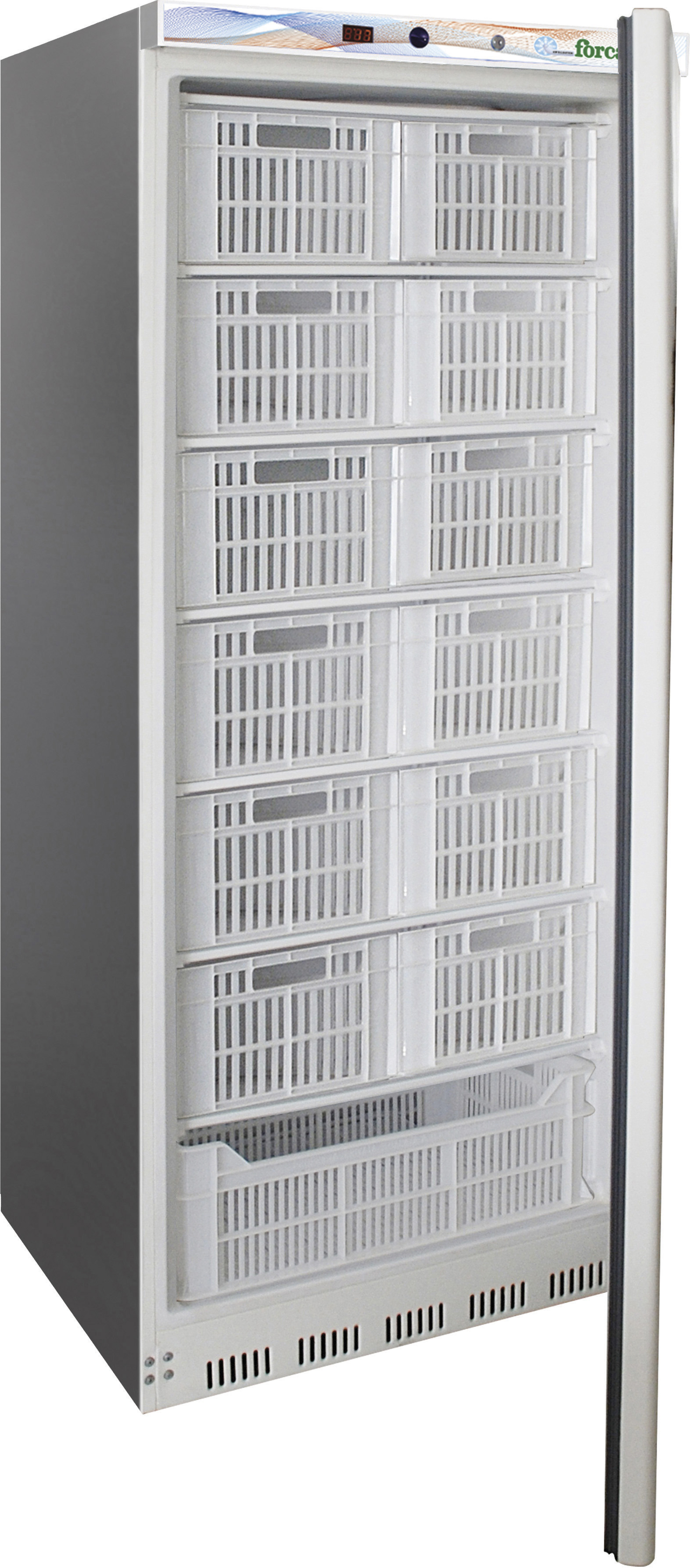 Armadio refrigerato con struttura esterna in acciaio inox, interno ABS e pannelli esterni di fondo e retro in lamiera zincata. Refrigerazione statica con ventilatore interno per uniformare la temperatura.