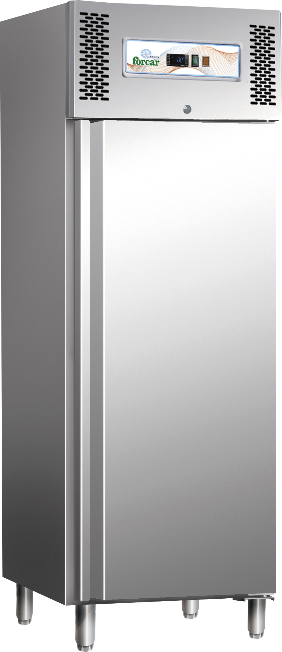 Armadio refrigerato realizzato in acciaio inox AISI 304, dotato di piedini regolabili, controllo temperatura elettronico con termostato digitale e refrigerazione ventilata. Gruppo incorporato ed evaporatore posizionato a scomparsa, con trattamento anticorrosione. Vano motore con fianchi coibentati. Dispone di resistenza elettrica intorno alla cornice (per l'eliminazione della condensa) e sbrinamento automatico con resistenza elettrica e controllo automatico della temperatura di sbrinamento. Evaporazione automatica dell'acqua di condensa. Porta (chiusura porta con chiave) con molla di ritorno e reversibile escluso GNV600. Guarnizione porta estraibile senza utensili. Luce interna. Fondo con angoli arrotondati. Pannelli esterni di fondo e schienale in lamiera galvanizzata.
