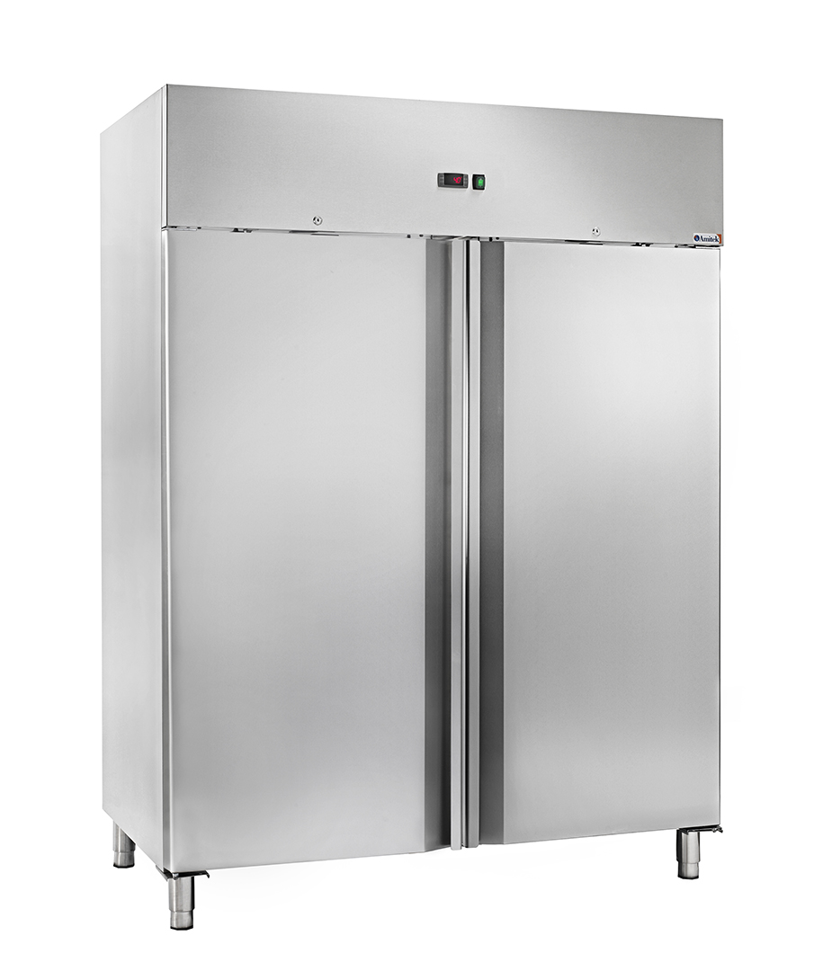 Armadio refrigerato realizzato in acciaio inox AISI 304, dotato di piedini regolabili, controllo temperatura elettronico con termostato digitale e refrigerazione ventilata. Gruppo incorporato ed evaporatore posizionato a scomparsa, con trattamento anticorrosione. Vano motore con fianchi coibentati. Dispone di resistenza elettrica intorno alla cornice (per l'eliminazione della condensa) e sbrinamento automatico con resistenza elettrica e controllo automatico della temperatura di sbrinamento. Evaporazione automatica dell'acqua di condensa. Porta (chiusura porta con chiave) con molla di ritorno e reversibile escluso GNV600. Guarnizione porta estraibile senza utensili. Luce interna. Fondo con angoli arrotondati. Pannelli esterni di fondo e schienale in lamiera galvanizzata.