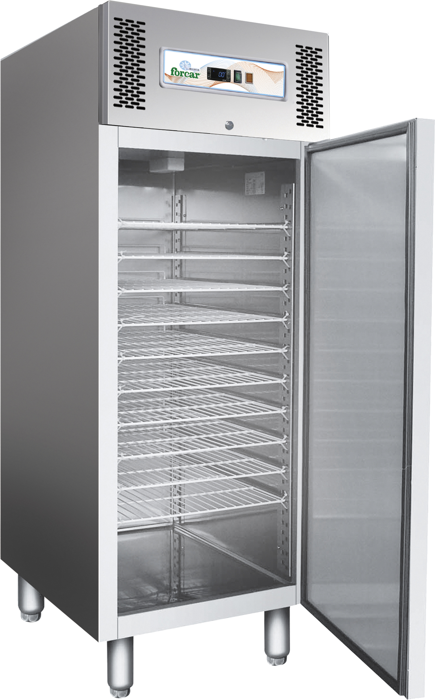 Armadio refrigerato realizzato in acciaio inox AISI 304, dotato di piedini regolabili, controllo temperatura elettronico con termostato digitale e refrigerazione ventilata. Gruppo incorporato ed evaporatore posizionato a scomparsa, con trattamento anticorrosione. Vano motore con fianchi coibentati. Dispone di resistenza elettrica intorno alla cornice (per l'eliminazione della condensa) e sbrinamento automatico con resistenza elettrica e controllo automatico della temperatura di sbrinamento. Evaporazione automatica dell'acqua di condensa. Porta (chiusura porta con chiave) con molla di ritorno e reversibile escluso GNV600. Guarnizione porta estraibile senza utensili. Luce interna. Fondo con angoli arrotondati. Pannelli esterni di fondo e schienale in lamiera galvanizzata.