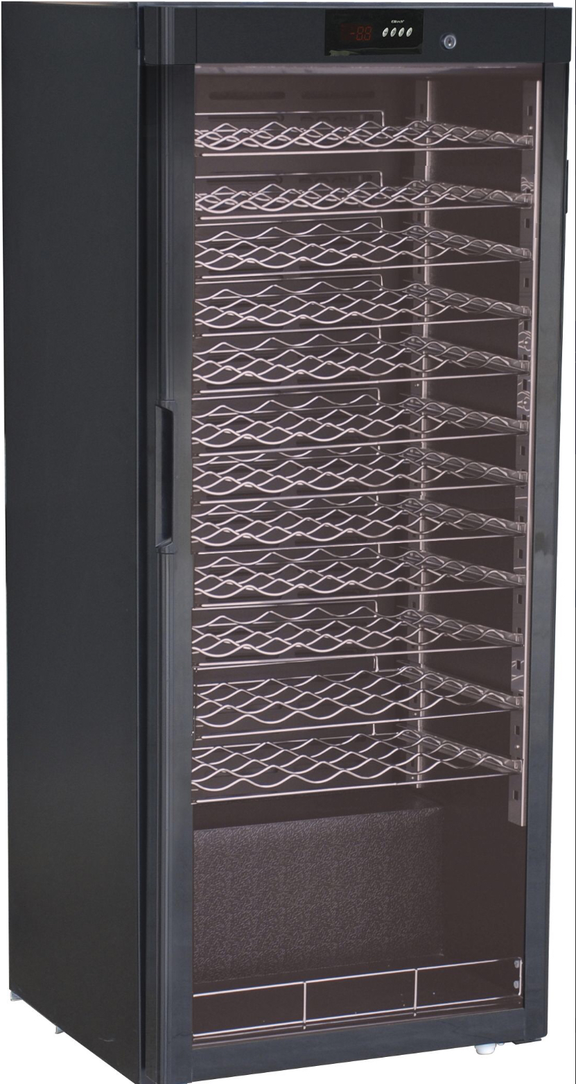 Cantinetta per vini con struttura esterna verniciata nera, interno alluminio nero goffrato, luce interna LED, doppio vetro temperato con protezione raggi UV. Possiede centralina e display digitali, refrigerazione statica con roll bond interno e temperatura differenziata a seconda della posizione (da 5°C del ripiano inferiore a 18°C di quello superiore).