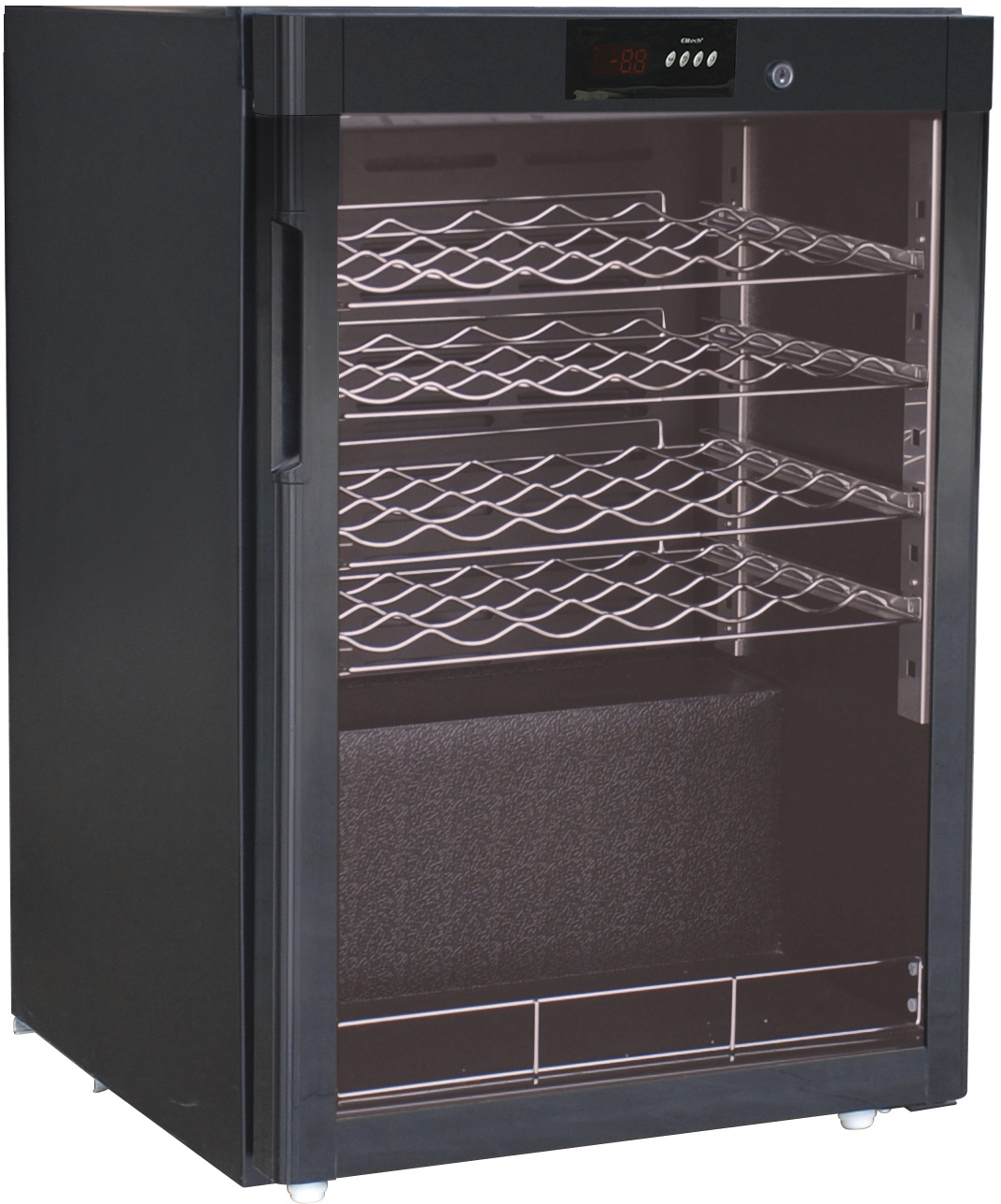 Cantinetta per vini con struttura esterna verniciata nera, interno alluminio nero goffrato, luce interna LED, doppio vetro temperato con protezione raggi UV. Possiede centralina e display digitali, refrigerazione statica con roll bond interno e temperatura differenziata a seconda della posizione (da 5°C del ripiano inferiore a 18°C di quello superiore).