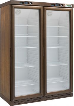 Cantinetta per vini realizzata in legno e dotata di porte con telaio in legno massiccio e vetrocamera. Dispone di refrigerazione di tipo statico con evaporatore in piastra di alluminio posizionato sulla parete di fondo e di termoregolatore per il controllo automatico della temperatura (Ventilatore interno collegato direttamente all'alimentazione per rendere uniforme, in tutti i vani, la temperatura). Evaporazione acqua di condensa automatica, illuminazione a plafoniera comandata da interruttore.