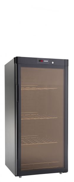 Espositore refrigerante per vino con centralina e display digitali. Refrigerazione statica con protezione per roll bond. Temperature differenziate a seconda della posizione: più caldo in alto ( per vini rossi), più freddo in basso (per vini bianchi). Struttura in acciaio verniciato nero, interno in alluminio nero goffrato. Luce interna a led azzurri. Compressore a bassa rumorosità. Doppio vetro temperato con protezione dai raggi U-V. Porta non reversibile. Chiusura porta con chiave.