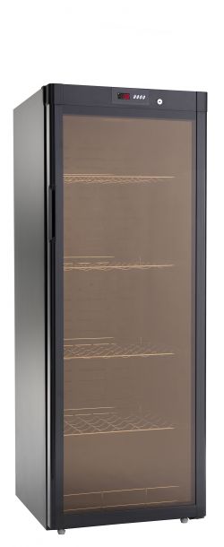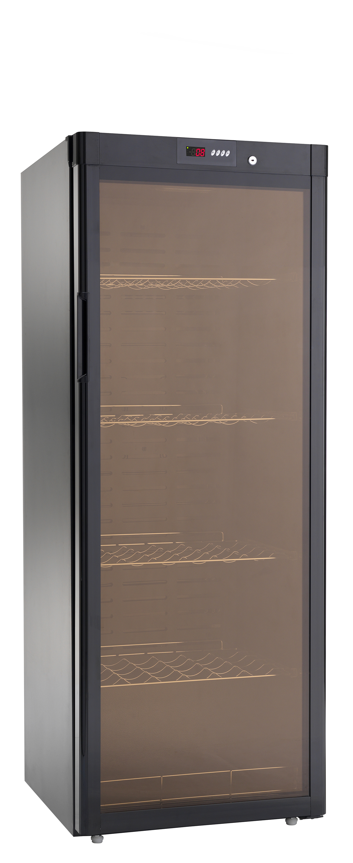Espositore refrigerante per vino con centralina e display digitali. Refrigerazione statica con protezione per roll bond. Temperature differenziate a seconda della posizione: più caldo in alto ( per vini rossi), più freddo in basso (per vini bianchi). Struttura in acciaio verniciato nero, interno in alluminio nero goffrato. Luce interna a led azzurri. Compressore a bassa rumorosità. Doppio vetro temperato con protezione dai raggi U-V. Porta non reversibile. Chiusura porta con chiave.