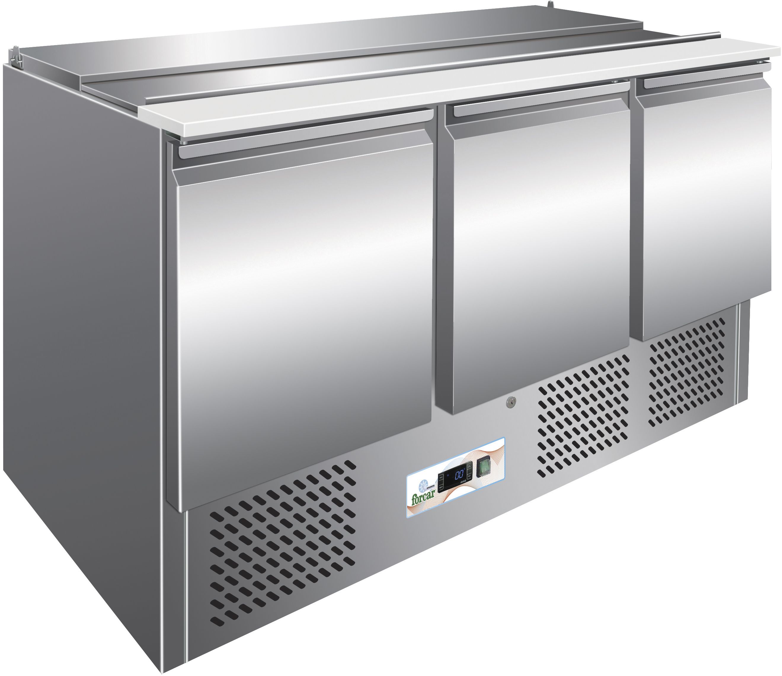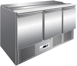 Saladette refrigerata per insalate. Struttura in acciaio inox AISI 304. Sbrinamento automatico.Capacità bacinelle GN N.4 1/1. Evaporatore statico schiumato su tre lati con ventola per uniformare la temperatura. Coperchio ad apertura telescopica. Pianetto di lavoro in polietilene alimentare. Una griglia intermedia per porta. Termostato elettronico. Bacinelle escluse.