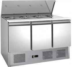 Saladette refrigerata per insalate. Struttura in acciaio inox AISI 201. Sbrinamento automatico. Capacità bacinelle GN N.4 1/1. Evaporatore schiumato su tre lati con ventola. Coperchio ad apertura telescopica. Pianetto di lavoro in polietilene alimentare. Una griglia intermedia per porta. Termostato elettronico. Bacinelle escluse.