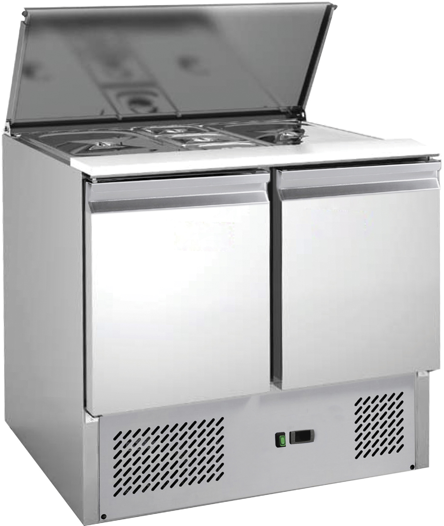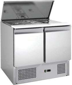 Saladette refrigerata per insalate. Struttura in acciaio inox AISI 201. Sbrinamento automatico. Capacità bacinelle GN N.2 1/1 + N.3 GN 1/6. Evaporatore schiumato su tre lati con ventola. Coperchio ad apertura telescopica. Pianetto di lavoro in polietilene alimentare. Una griglia intermedia per porta. Termostato elettronico. Bacinelle escluse.