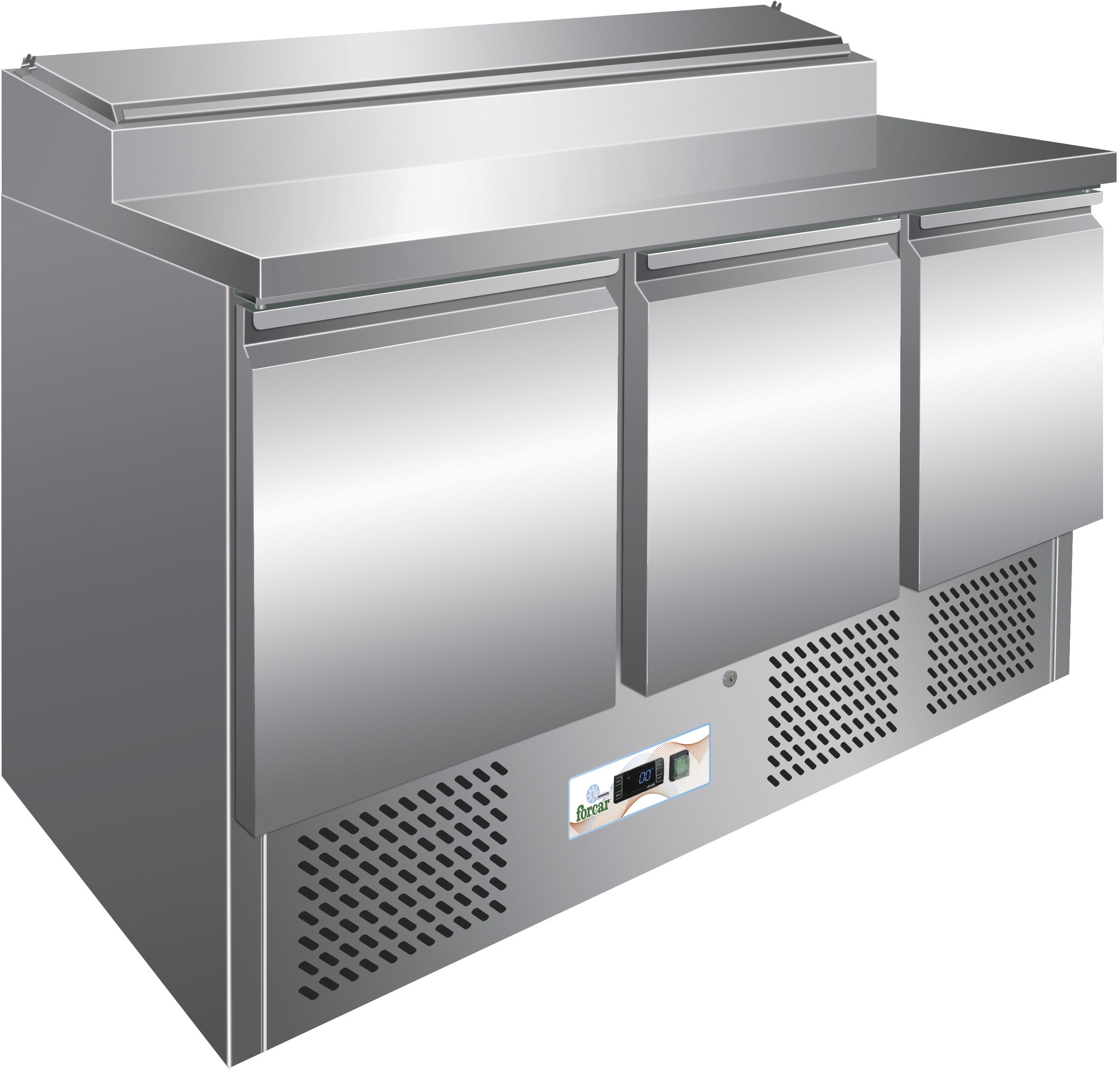 Saladette refrigerata Statica con struttura e piano di lavoro in acciaio inox AISI 304. Capacità bacinelle GN N.8 1/6 (escluse).