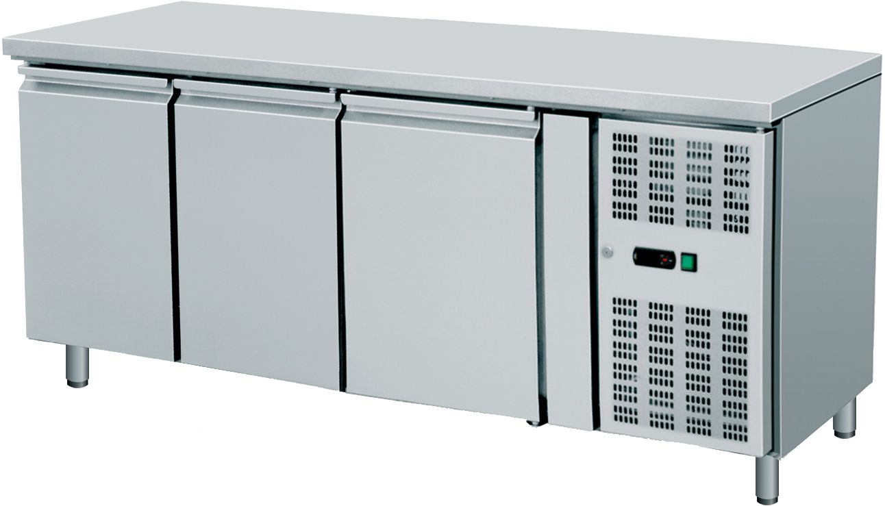 Tavolo refrigerato con Struttura interna ed esterna realizzata interamente in acciaio inox AISI 304. Refrigerazione ventilata con evaporatore ad alette trattato anticorrosione. Ricircolo aria fredda. Gruppo incorporato. Termostato digitale per il controllo della temperatura e dello sbrinamento. Resistenza elettrica inserita nella cornice della porta per l'eliminazione della condensa. Evaporazione automatica dell'acqua di condensa. Spessore isolamento 60 mm. Guarnizione magnetica facilmente estraibile.Interno con angoli arrotondati per facilitare la pulizia. Chiusura pannello frontale con chiave. Piedini in acciaio inox AISI 304 regolabili. Pannello posteriore in acciaio inox.