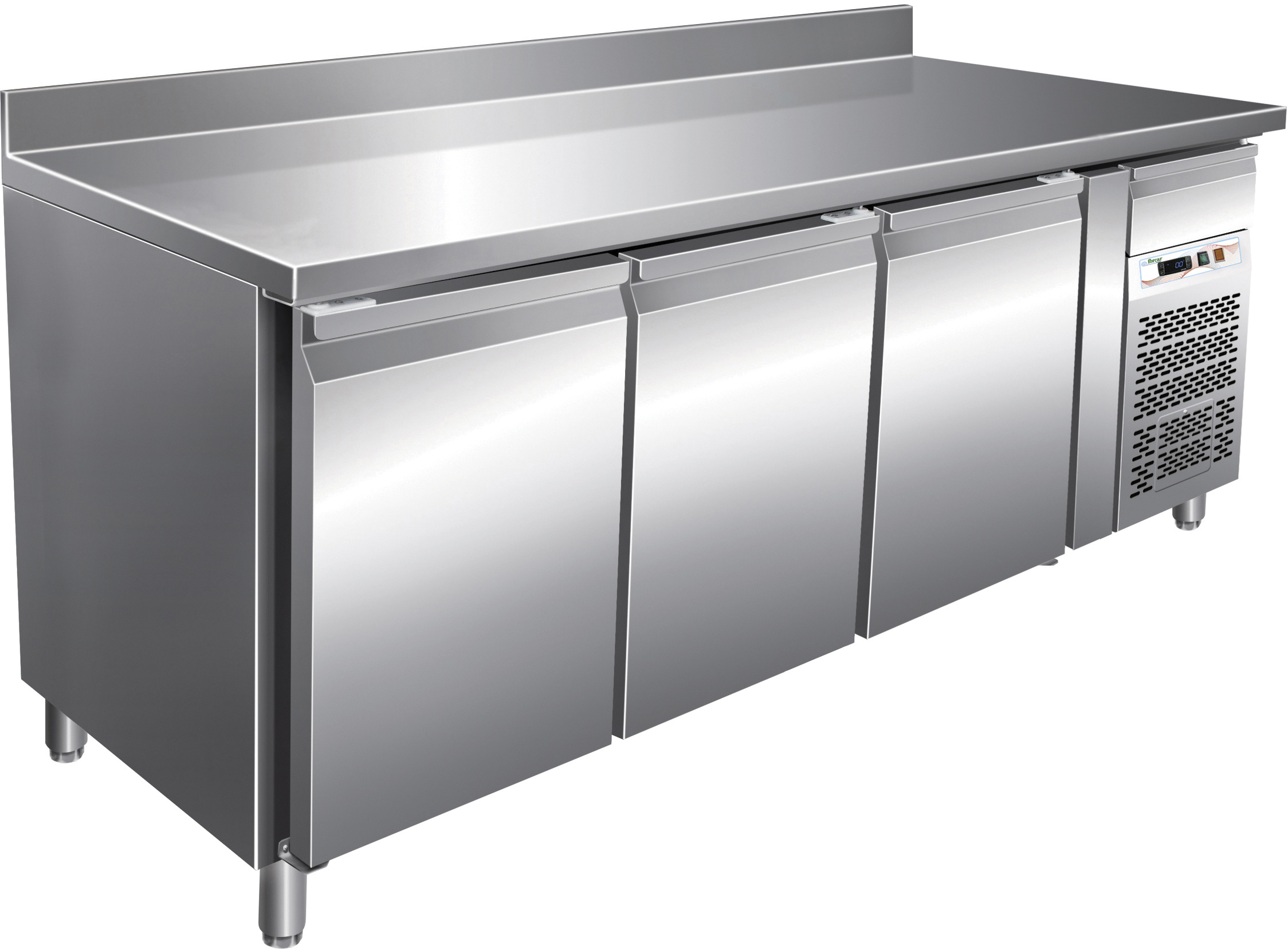 Tavolo realizzato in acciaio inox AISI 304, dotato di piedini regolabili e schienale in acciaio inox con possibilità di appoggiare al muro. Dispone di controllo temperatura elettronico con termostato digitale, refrigerazione ventilata e gruppo incorporato estraibile per facile manutenzione. Pannello frontale apribile con chiave. Andamento circolare dell'aria fredda in modo da non toccare direttamente il prodotto. Fornito di resistenza elettrica intorno alla cornice porta (per eliminazione della condensa), sbrinamento automatico con resistenza elettrica e controllo automatico della temperatura di sbrinamento. Evaporazione automatica dell'acqua di condensa con evaporatore trattato anticorrosione. Porta con molla di ritorno e guarnizione estraibile senza utensili. Fondo con angoli arrotondati. Facile intercambiabilità porte con cassettiere da due e tre cassetti. Cassettiere con guide telescopiche in acciaio inox a totale estraibilità.