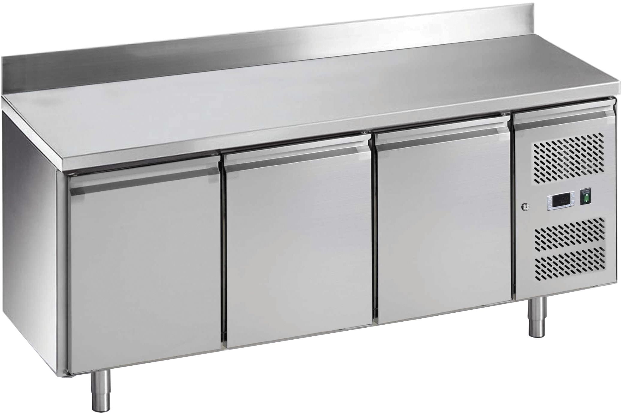 Tavolo realizzato in acciaio inox AISI 304. Refrigerazione ventilata. Gruppo incorporato estraibile per facile manutenzione. Pannello frontale apribile con chiave. Andamento circolare dell'aria fredda in modo da non toccare direttamente il prodotto. Controllo temperatura elettronico con termostato digitale.