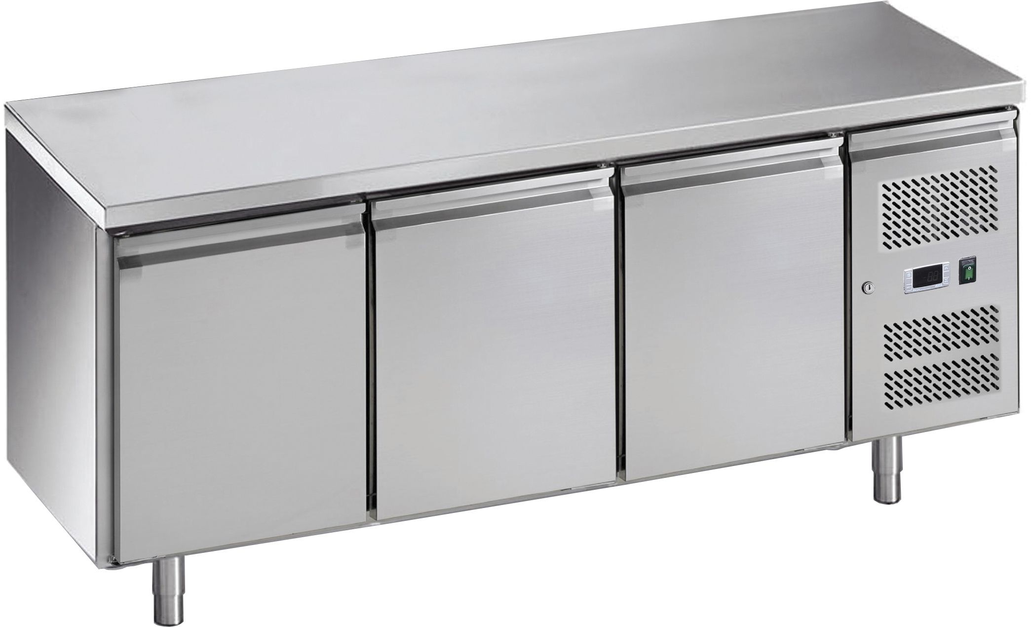 Tavolo realizzato in acciaio inox AISI 304. Refrigerazione ventilata. Gruppo incorporato estraibile per facile manutenzione. Pannello frontale apribile con chiave. Andamento circolare dell'aria fredda in modo da non toccare direttamente il prodotto. Controllo temperatura elettronico con termostato digitale.