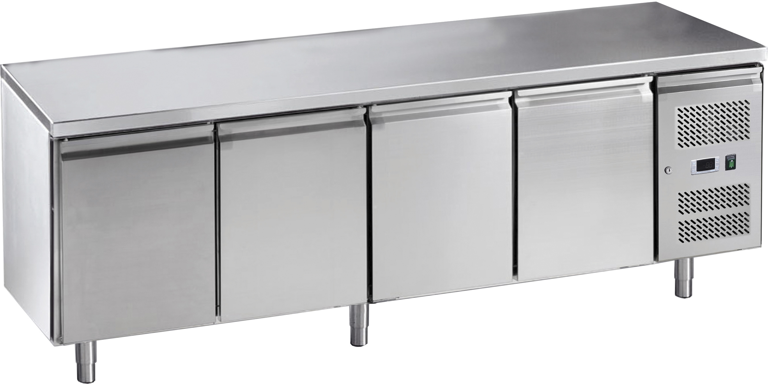Tavolo realizzato in acciaio inox AISI 304. Refrigerazione ventilata. Gruppo incorporato estraibile per facile manutenzione. Pannello frontale apribile con chiave. Andamento circolare dell'aria fredda in modo da non toccare direttamente il prodotto. Controllo temperatura elettronico con termostato digitale.